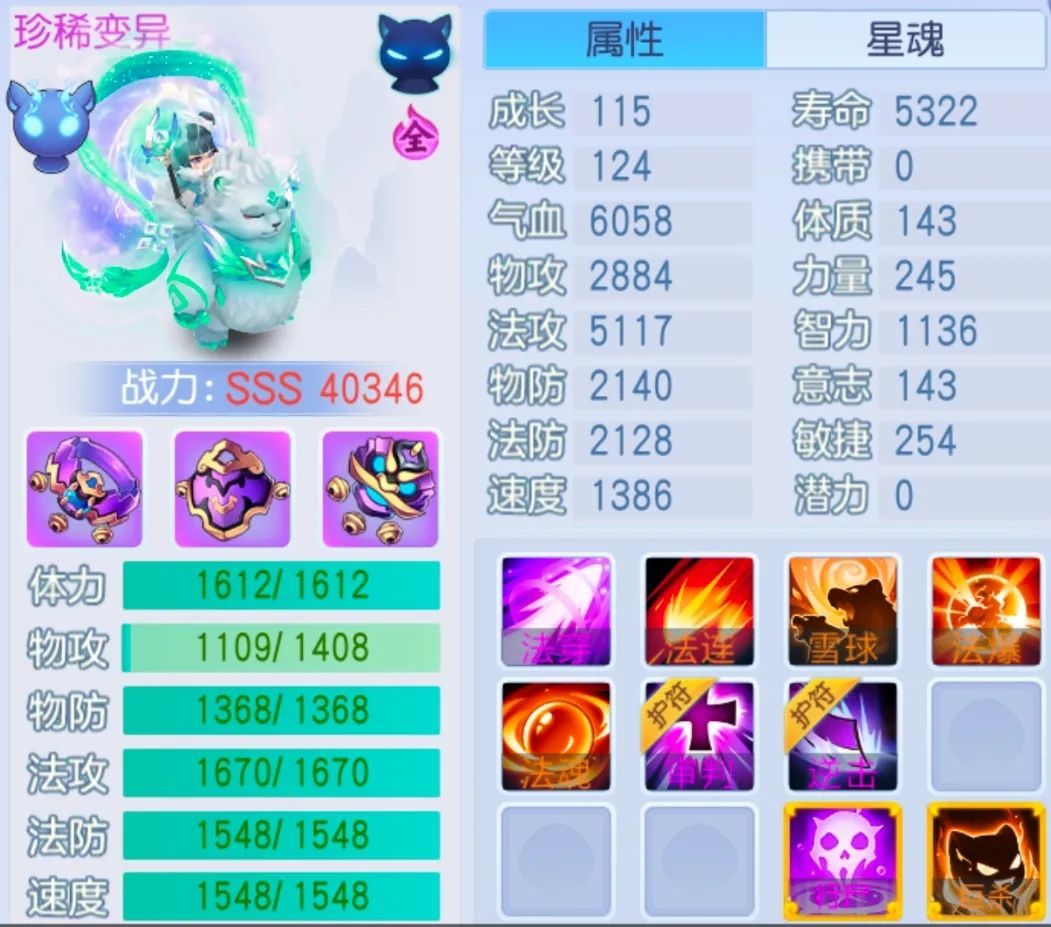 宠物的进攻能力发挥到极致,星魂属性出色,法攻和速度表现优异,搭配非常完美。
