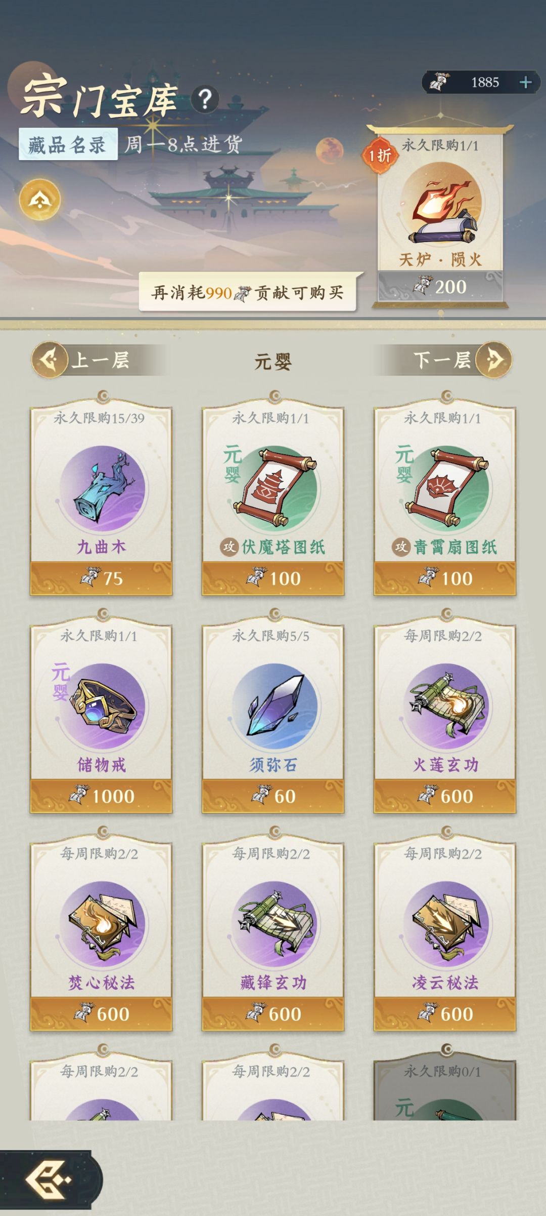 宗门贡献更是不可缺的,建议每天3~4次闭关,氪佬可以选择更高,金丹期0氪玩家,低氪玩家可以选择不去兑换炼器图纸,(节省400贡献,当周可以换得本命神通一本),元婴期根据自身的选择去兑换图纸,这个时候需要大量的木头来提升洞府等级,所以说贡献是必须要有的。
