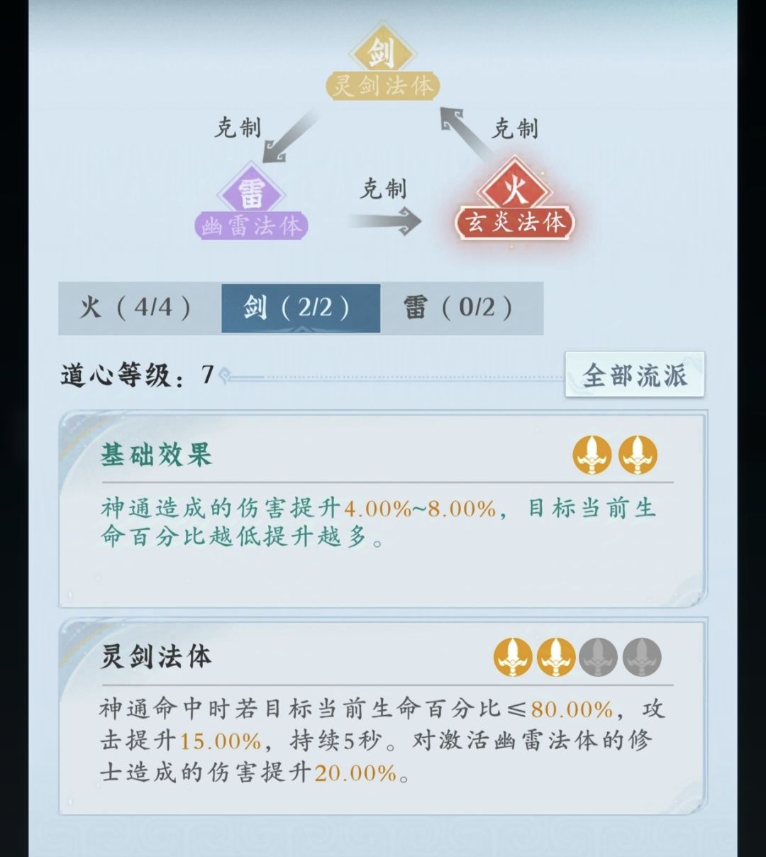 2.选择自己的玩法(雷,火,剑)可以装备6个神通,在一个属性大于4本可以激活相对应的属性,其中雷克火,火克剑,剑克雷。(平均玩家或者低氪玩家推荐玩火修,剑修。)选定以后最好不要动,因为你的主线剧情会根据你选的阵容而给你搭配金色神通。