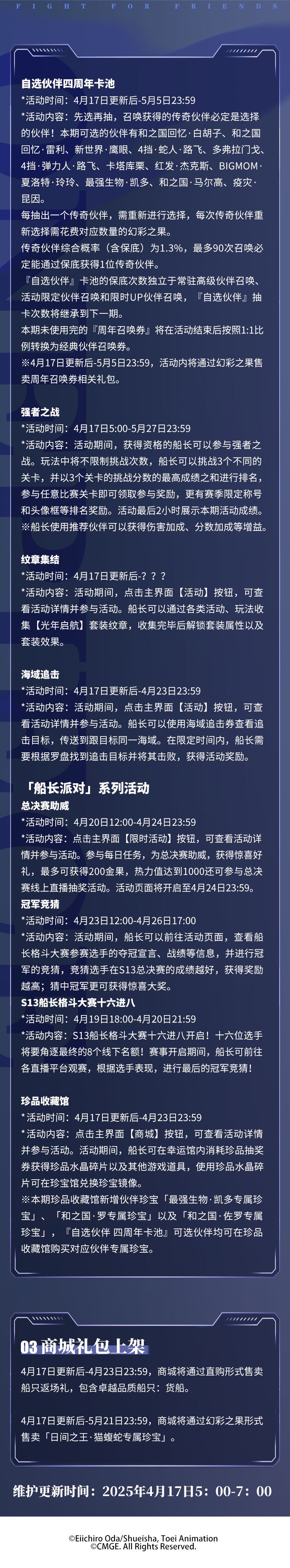 每周例行维护,山智的旅途开启!杰尔玛家族陆续登场,周年庆活动开启,超多福利活动上线,还有四周年庆自选卡池限时开启!