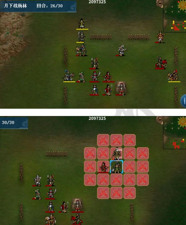 每 5 回合,敌军会有一部分兵力主动出击。我军任意一人越过(X,12),敌人全军出击,敌全属性上升。