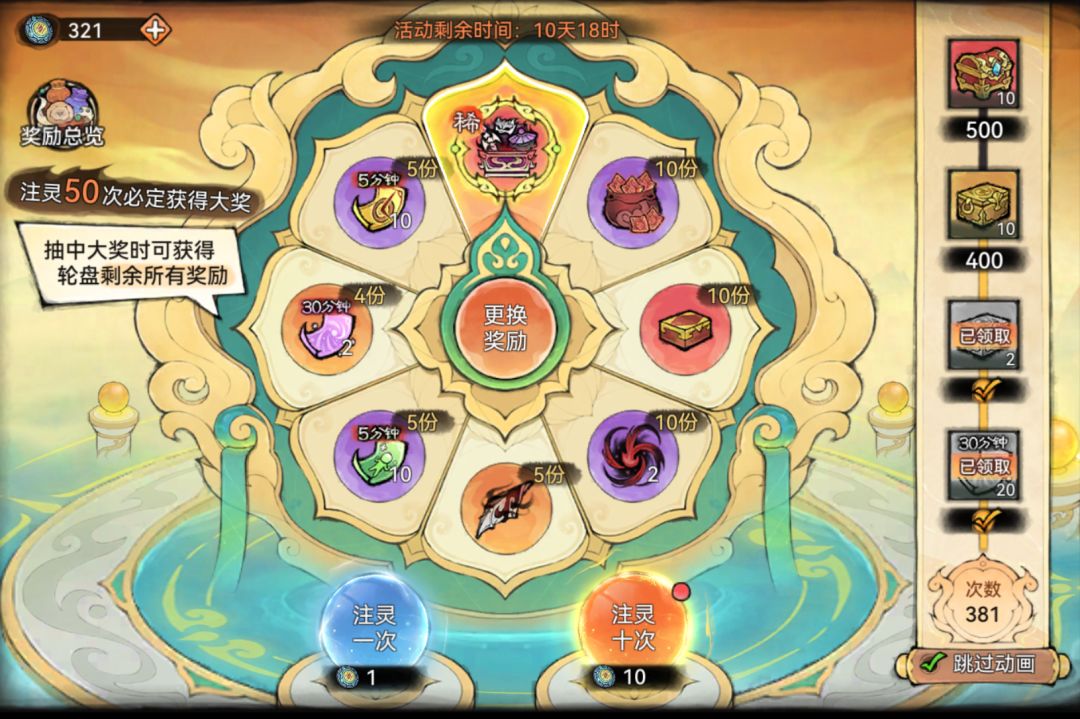 当注灵抽中大奖时,会获得轮盘上剩余所有奖励,并重置轮盘。