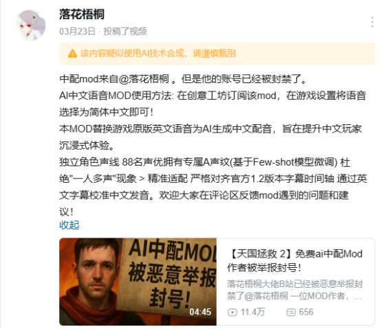 《天国拯救2》AI中配MOD作者,“落花梧桐”被举报封号。