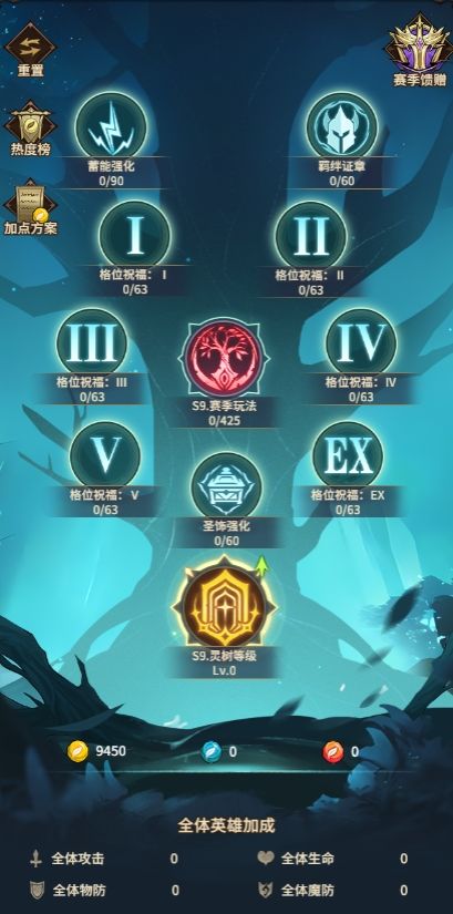 希望灵树可以提升赛季玩法中每个站位英雄的属性,例如攻击力,生命值上限等。玩家通过各类赛季副本可以获得灵树的养成材料-灵珠,从而对自己的希望灵树进行加点养成,取得更好的战斗结果。