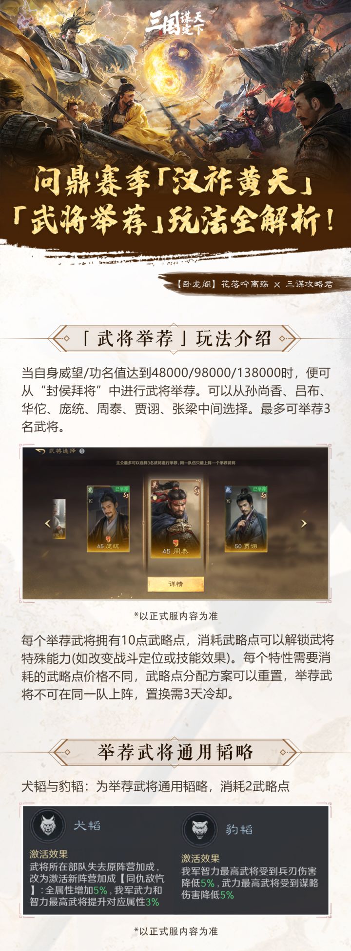 问鼎赛季「汉祚黄天」丨「武将举荐」玩法全解析!