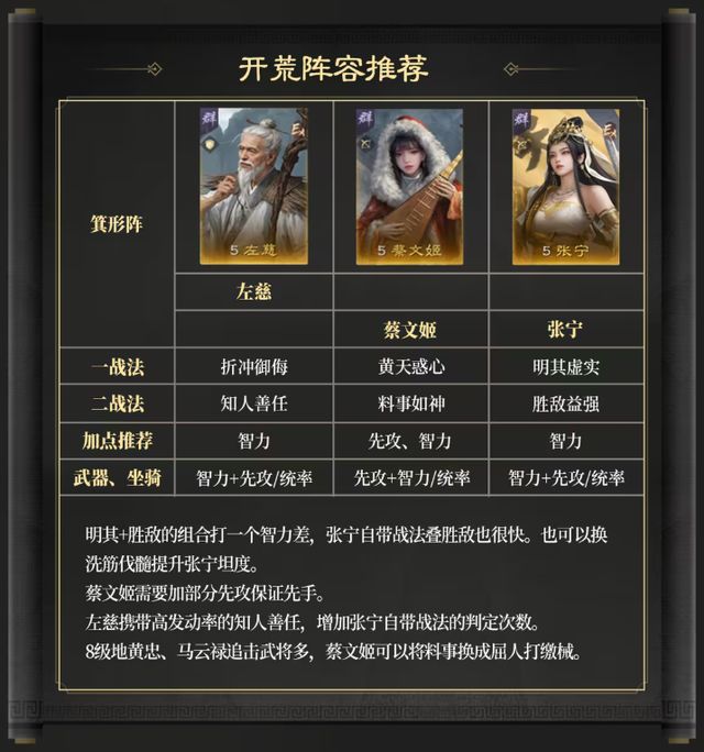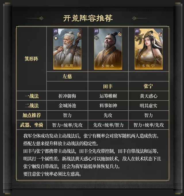 张宁定位为法术体系辅助,在开荒期搭配左慈、田丰或左慈、蔡文姬具有极高的强度,不但开荒好使,打架也不带怂的,面对热门主流的队伍也有不低的胜率。以左慈、田丰、张宁为例,其战斗思路是我军全体成功发动主动战法后,张宁有概率会对敌军随机两人造成伤害。搭配左慈来提升释放主动战法的稳定性。田丰与张宁都携带主动战法,田丰全先攻带控制,田丰自带战法和运筹、明其打一个属性差。新战法黄天惑心可以施加妖术,敌人在妖术状态下且张宁触发自带战法,还会为我军最低单体恢复兵力,这让张宁的队伍作战时战损比例远低于敌方部队。