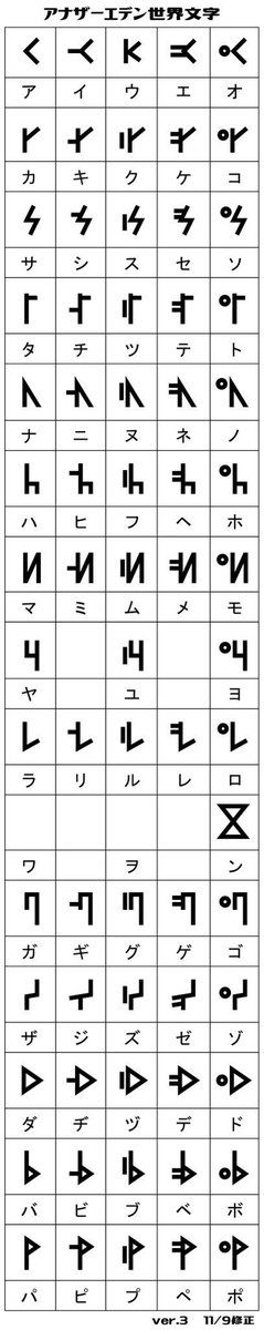 在《另一个伊甸:超越时空的猫》的世界中,同样存在着这种专属文字,其根据日文假名表与数字重新做了一套有些卢恩符文造型的文字体系,在游戏中三个时代中通用。下述为假名部分的对照表,可以根据此了解一下游戏内有文字的地方写着什么,此外数字部分也是有专门设计的,大家可以先猜一猜再搜索了解一下,看是不是和自己的想法一致。