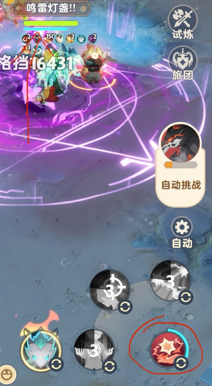 说方法:开局看法师的普攻条他会顺时针有个蓝色的条充能,快充满的时候,把2个其他的小技能开了,充满的前一瞬间,按宠物技能,充满开“鸣雷序曲”(如图3,血条下面的蓝条刚出现,或右下角蓝圈转完一圈,或监测buff栏元素亲和出现.但最后一种比较不方便)