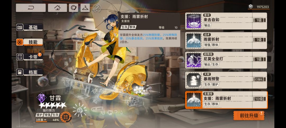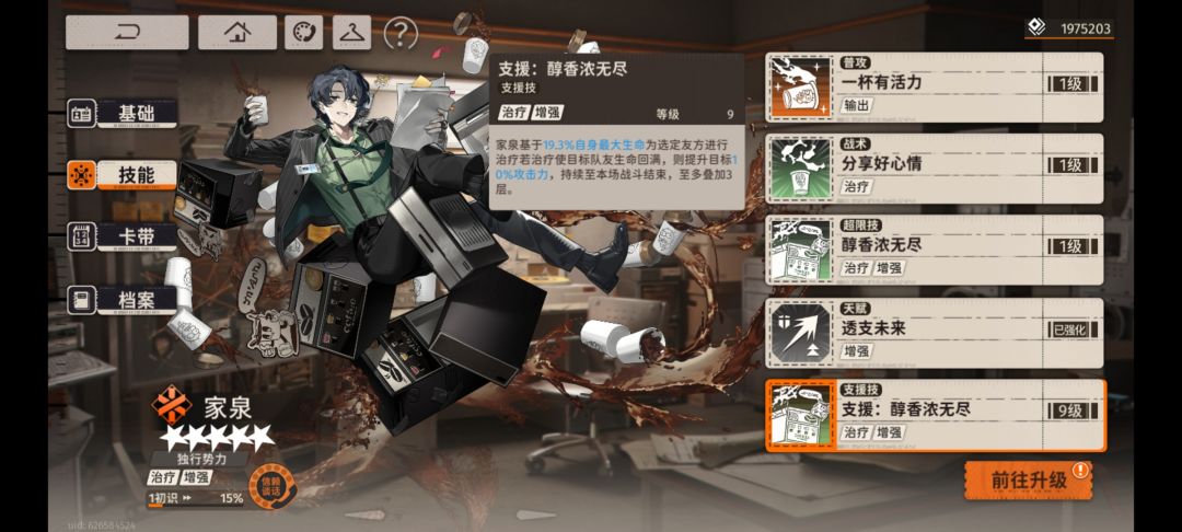 t0.5家泉,家泉支援技是在本场战斗回血加永久攻击力(6级以前加7%攻击力到了6级以后是加10%攻击力最高可叠加3层)在打险境跟蓝色站台都是最佳的第二人。家泉的支援技吃卡带的血量加成,支援技需要把支援的人物奶满才能加攻击力所以,需要一定的练度。(加点建议升满)