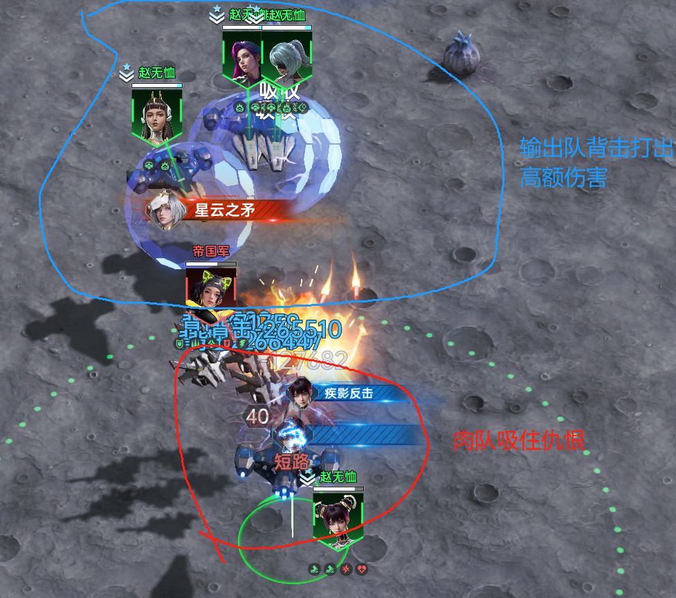 手动公式法打法为肉盾吸引仇恨,治疗加血,输出队伍绕背攻击