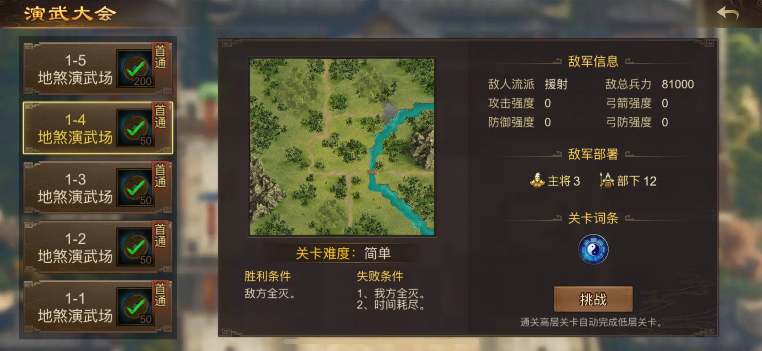 大将1、部下10,流派单挑,总兵力80000,0兵装。击败大将即胜。