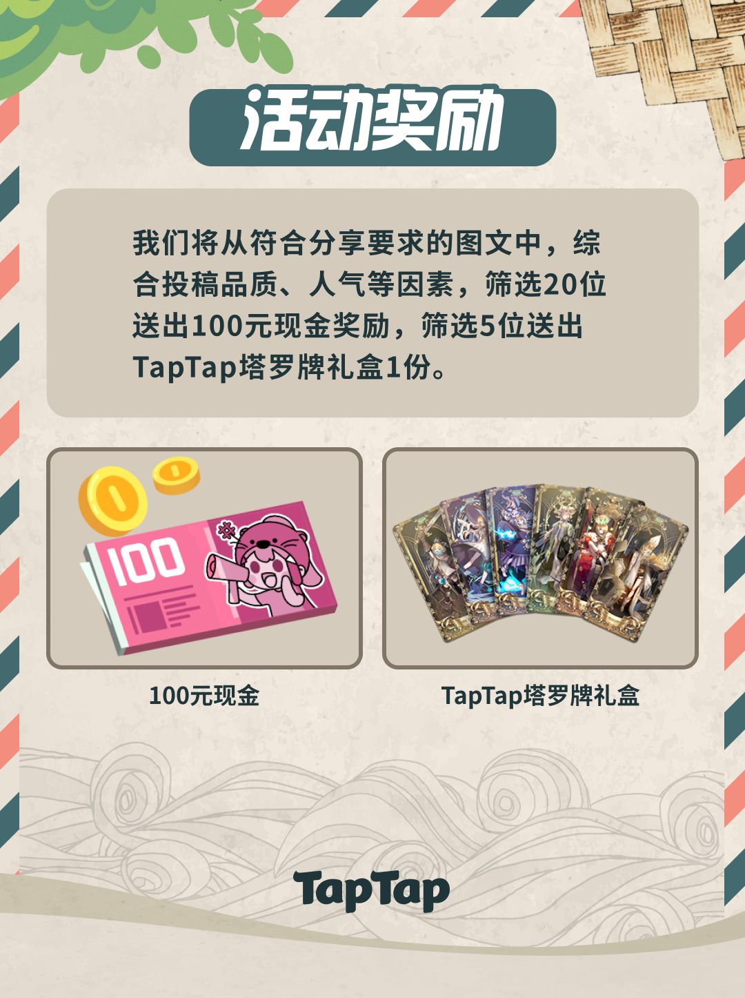 我们将从符合分享要求的图文中,综合投稿品质、人气等因素,筛选20位送出100元现金奖励,筛选5位送出TapTap塔罗牌礼盒1份。
