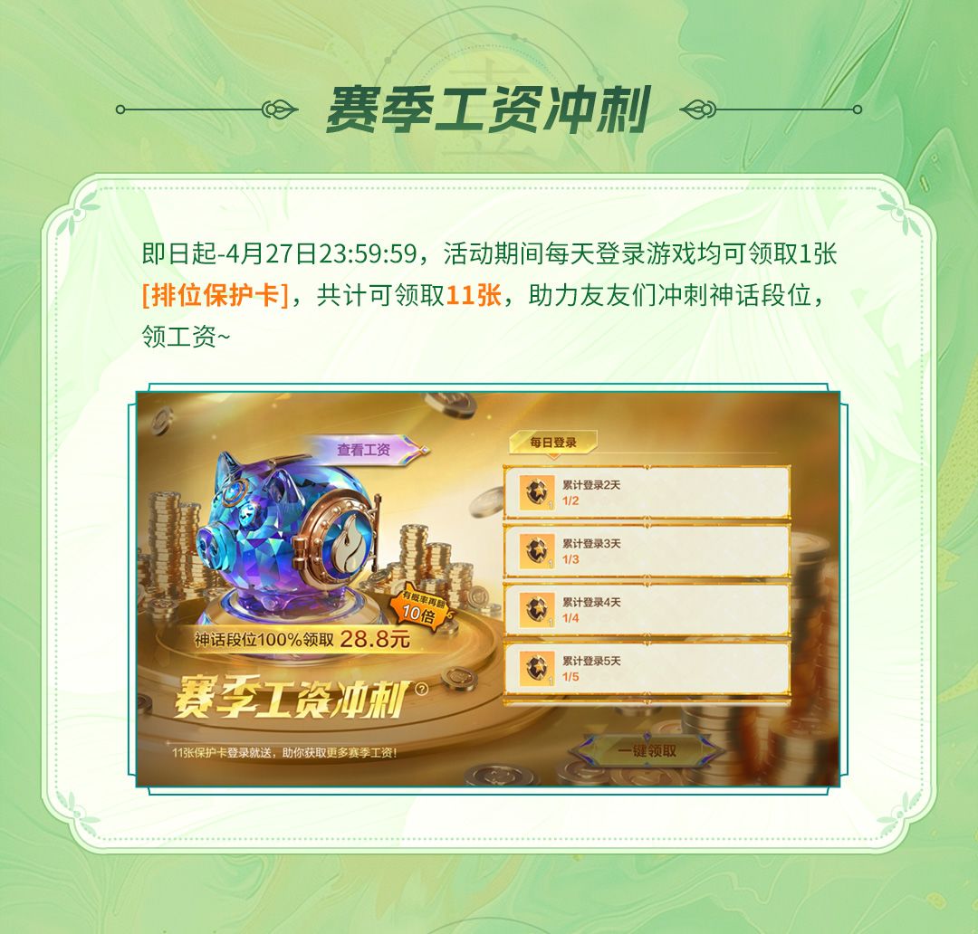 S1赛季迎来最后冲刺,S2赛季即将开启!咱们打排位可是有工资的!4月28日S2赛季开启后,上线即可领取S1赛季段位工资,同时S1段位工资加码,神话段位保底可拿28.8元!更有几率能够暴击获得10倍奖励!