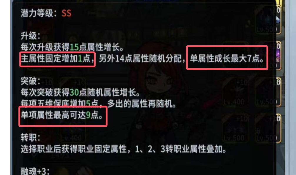 1、每次升级,主属性最低加成是1,最高加成是7