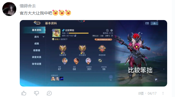 在本贴评论区晒出自己的本命英雄并且打到区top50的截图,附上平台昵称的水印即报名成功,将从报名用户中随机抽取5位符合规则的用户获得奖励