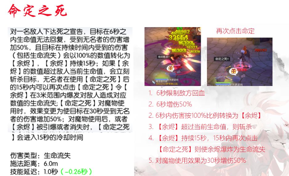如果【余烬】达到斩杀线斩杀则消失,如果没达到斩杀线,则【余烬】会存在15秒,15秒内再次点击【命定之死】则会将【余烬】触发爆炸,造成3米范围内敌人生命流失伤害。