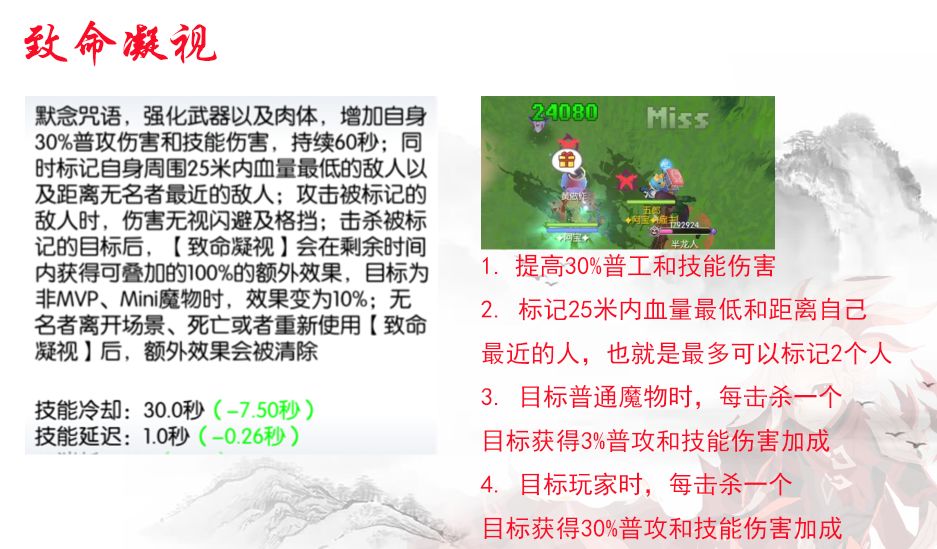 可以提供30%普攻加成和技伤加成,同时标记25米内血最少的敌人和离自己最近的敌人;