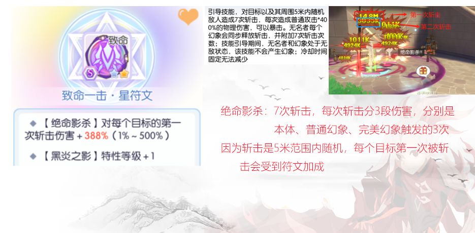 - l 斩击一共7次,但是每次斩击数字是分三段的,我理解是本体、触发幻象和完美幻象同时触发的3段伤害。可能有人问我都没召唤完美幻象呢?但是只能这么理解,因为每次释放【绝命影杀】的瞬间,完美幻象都会突然消失,【绝命影杀】释放完了后完美幻象又出现了。