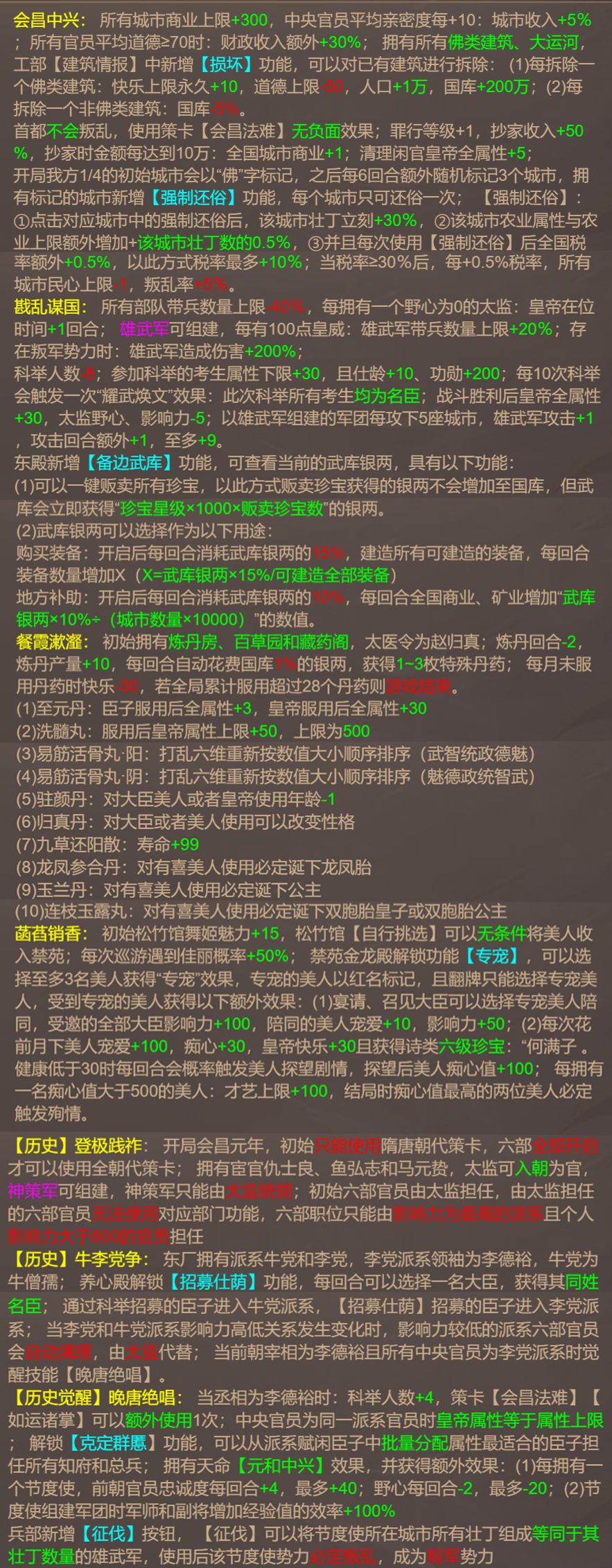总体来说,该张帝卡很好的模拟了武宗时期的前期“会昌法难”和他个人的痴迷修道,新增的特殊丹药填补了丹药长期没有更新的弊端,并且具体的效果也十分亮眼。在具体的词条“牛李党争”下也暗示了两大派别的斗争根源:即守旧门阀同新兴寒门科举入仕学子间难以调和的矛盾。