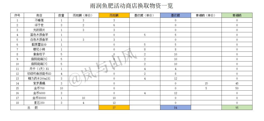 想要搬空商店需要雨斑鲷37条,墨纹鲤84条,青潮鳞95条。