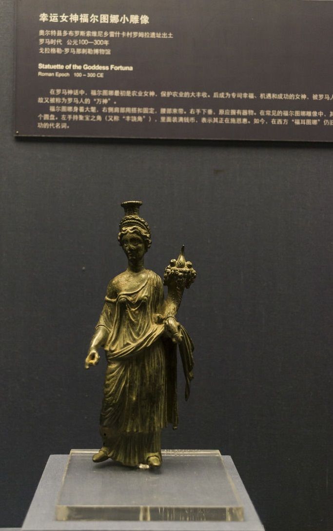 在西方神像中,福尔图娜常常一手拿着象征丰饶和富裕的羊角,一手拿着主宰人们时运的方向舵,站在旋转的飞轮之上。西方人认为,福尔图娜手中的方向舵和脚下的飞轮转到哪里,就把人们的时运带到哪里。但由于方向的变化不定,福尔图娜脚下飞轮也用以象征祸福无常,惩罚那些贪得无厌之人。
