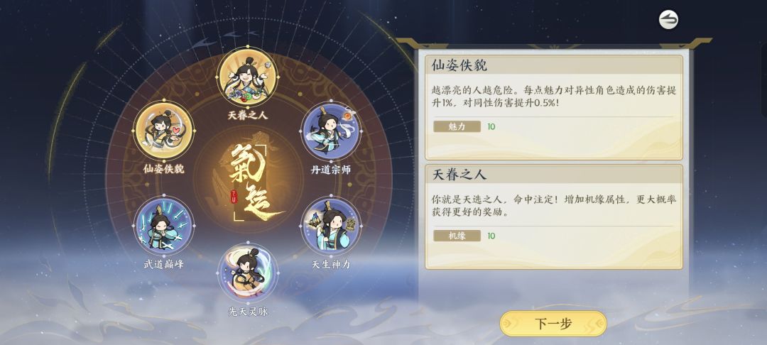 首选天眷之人+天生神力(加攻+奖励更丰富),其次天眷之人+丹道宗师(能更快晋升境界)