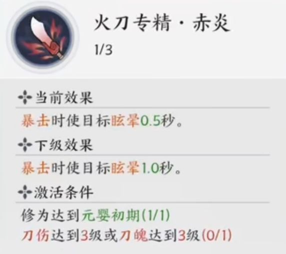 天赋方面,在元婴期点出火刀专精的暴击眩晕1s后,凭借其高攻击频率可以实现永控,生存能力大大提高