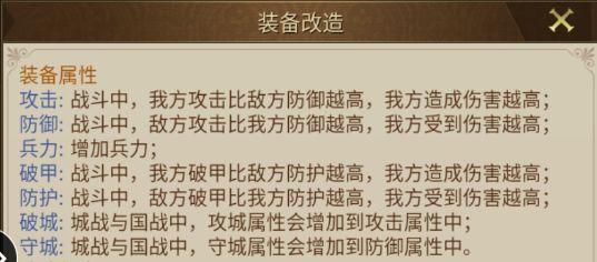 破甲和防护:选这个属性的不多,防护属性的话在打城刷战功的时候是需要的,因为城里的士兵带有破甲属性,所以需要堆一定的防护,不然打城很难打。破甲当然是相对应的攻击性属性喽。平时很少用的到,如果你想挑战高战玩家,可以留一套破甲装,专门培养一个破甲英雄去打高战,因为很少有人会堆防护属性。