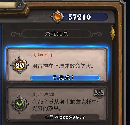 要点:速度抽牌靠圣契控场面活着(留一张4费法术到最后),抽到疲劳双周卓(佐拉可换流光之赐)以眼还眼+古神在上洗给对面各两张,下回合对面破掉你的古神还能挂以眼还眼和古神,到你回合用血爪战吼加A怪把自己血量控低,越低越好,实在太高就用疲劳控自己血量,血量够低的时候下魂缚灰舌打4费法术(自己决定带几费的,我觉得4费里直伤和A怪法术和抽牌比较多)触发对面古神,无论打对面脸触发以眼还眼还是a怪触发灰舌还是抽牌都能把自己弄死,成就完成!