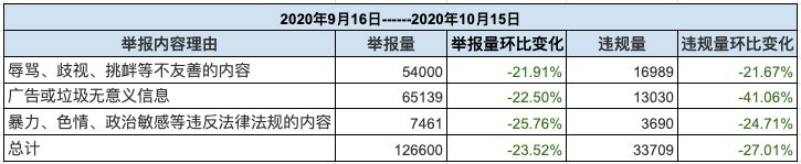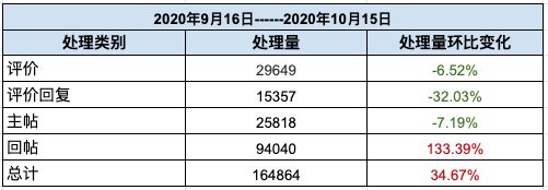 9月后两周加10月前两周的处理总量为164864,除回帖以外,各项数据都有明显减少,因为近期我们发现因参与论坛抽奖活动而恶意刷屏的现象又出现了,因此我们对部分内容进行了相应的处理,抽奖对于每个人都是公平的,重在参与,切勿进行违规行为来提高中奖率,损人也不利己。