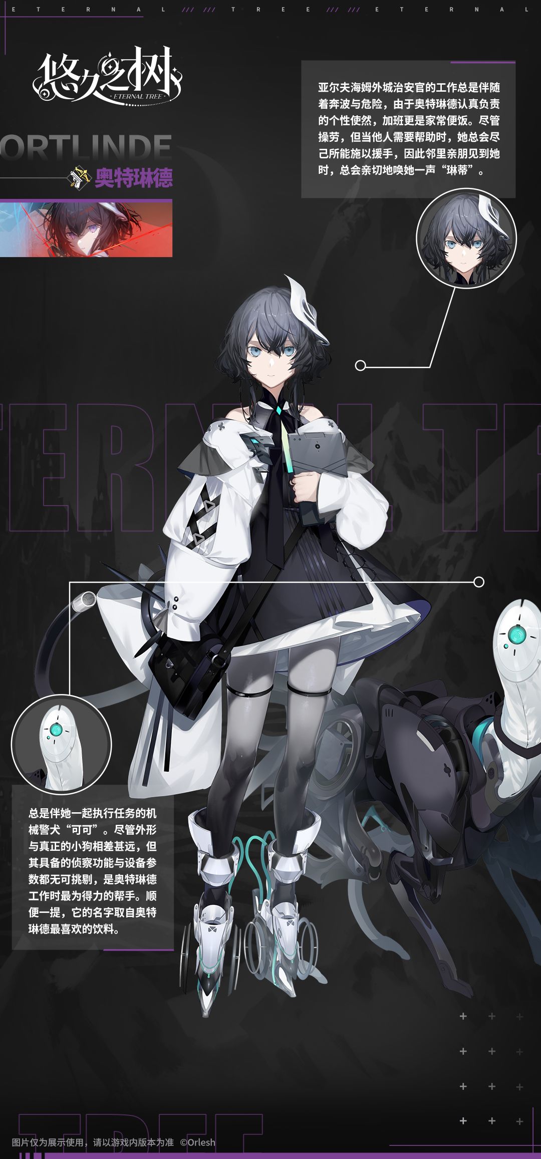 奥特琳德,亚尔夫海姆外城的治安官,街头巷尾常能见到她与搭档机械犬可可一同维护秩序的身影。凭借自己的坚韧与实力,奥特琳德在这片灰色地带做出了卓越的实绩,并且为了自己的理想——维护外城治安、保护他人免遭与自己相同的不幸,婉拒了来自内城区治安官高层的招揽。