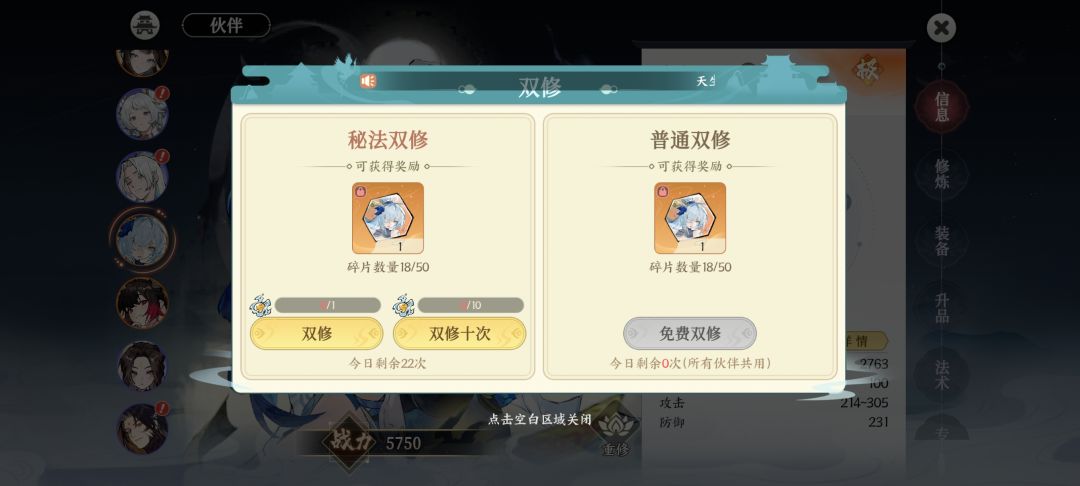 在人物形象旁边有个“双修”按钮,点一次给一个碎片