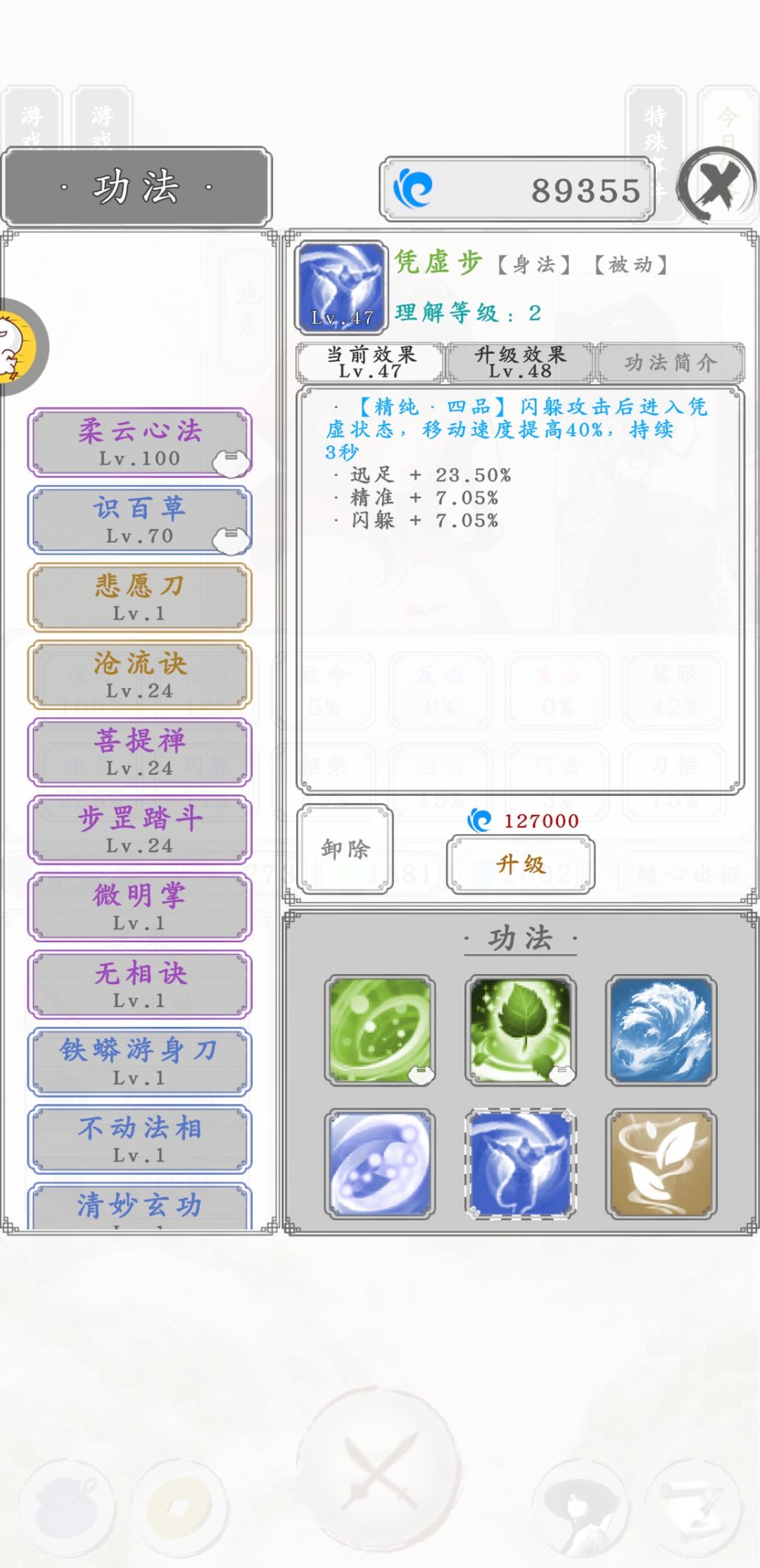 重要技能包括金色技能沧流,大幅提升护盾上限;蓝色技能凭虚步,叠加清风靴(蓝色即可)轻松增加 40% 多闪避。