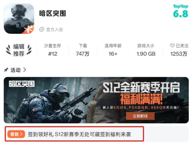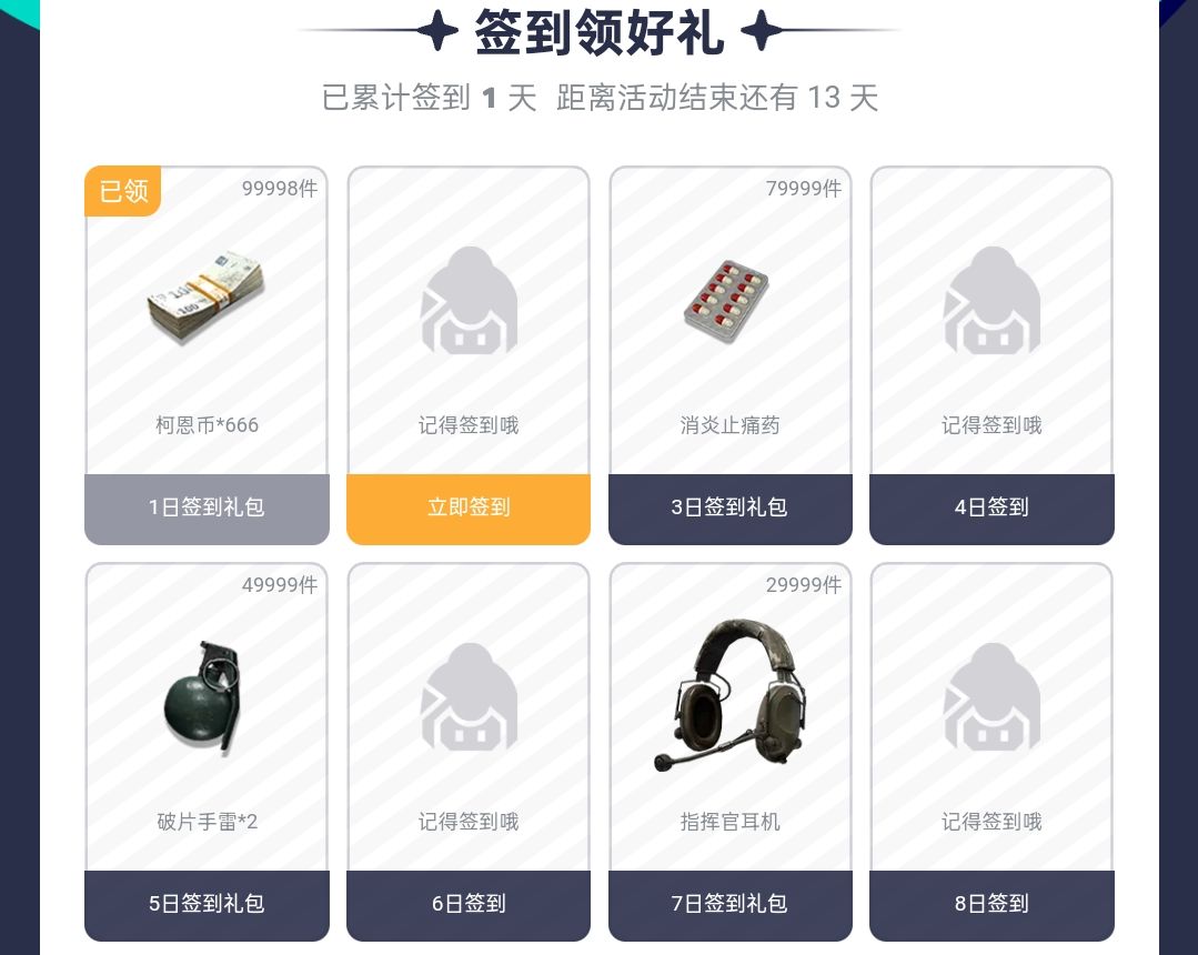 活动内容:在tap暗区突围首页-点击签到页面-立即签到或直接点击指路链接,进入后点击【立即签到】,活动期间内累计签到满对应天数即可获得相应奖励!