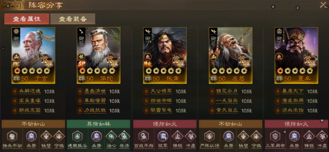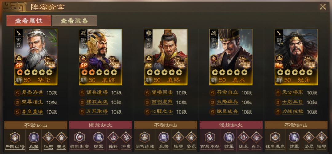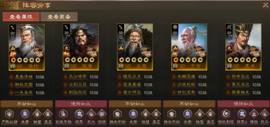 SP华佗加入后,整个队伍更难死了,且SP华佗自带战法对召唤兵同样有效,有概率为召唤兵提升免伤和驱散异常,召唤兵会更难死,SP张角叠层也会更容易。