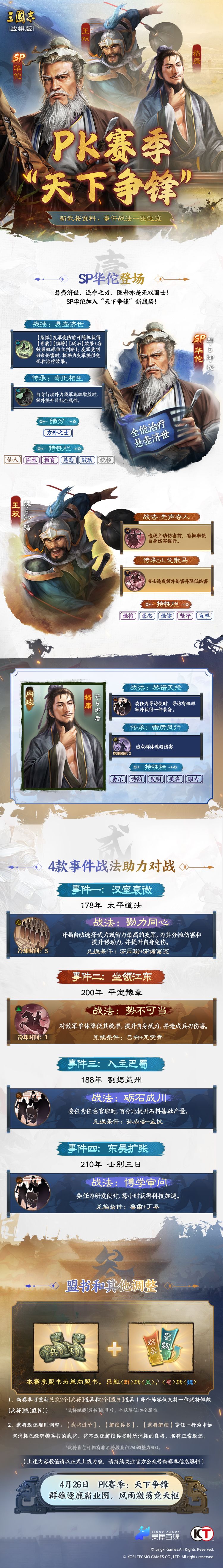主公们好呀!PK:天下争锋4月26日(下周六)就要正式开启了,最近讨论热度最高的,莫过于天下争锋的两位新武将了。今天,小柒有幸邀请到多位大神玩家,结合今天武将详细信息和大家点评解析SP华佗,并分享SP华佗的阵容推荐,一起来看看吧!