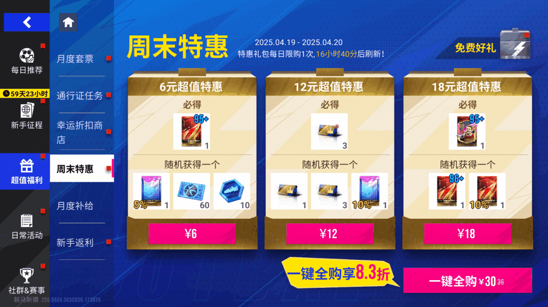 4月19日11时-4月20日11时期间,【周末特惠礼包】惊喜上线!每日登录可以以优惠的价格购买「95+巅峰球员包」「登场券」等特惠商品,一次性打包购买更可享超值折扣!