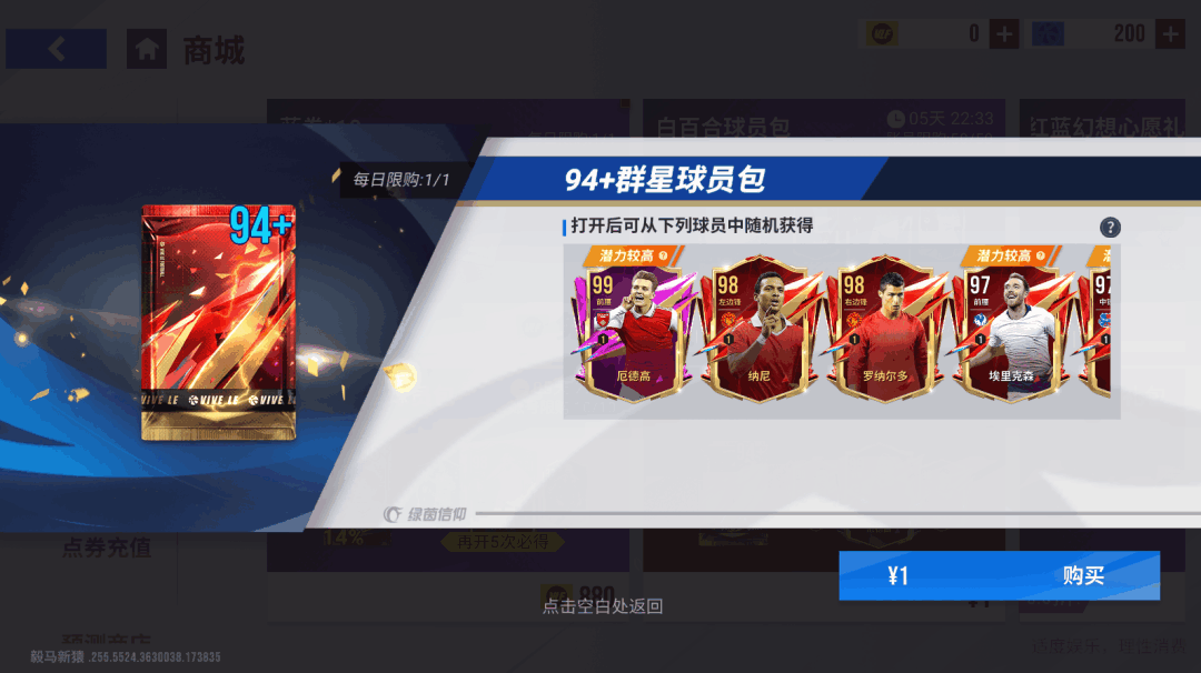 【94+群星球员包】,打开后可获得94-99潜力球员,有机会获得【99巅峰厄德高】,仅需1元,每日限购1次!
