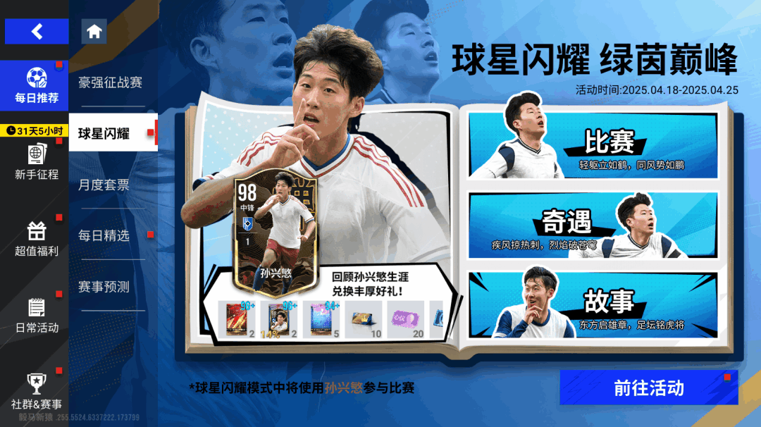 4月18日11时-4月25日11时期间,使用孙兴慜,回顾亚洲之光孙兴慜传奇生涯,兑换丰厚好礼!完成任务获得星光币,可在闪耀商城兑换「96+巅峰球员包」「白百合球员包」「德意志联赛球员包」「登场券」「心仪招募券」!