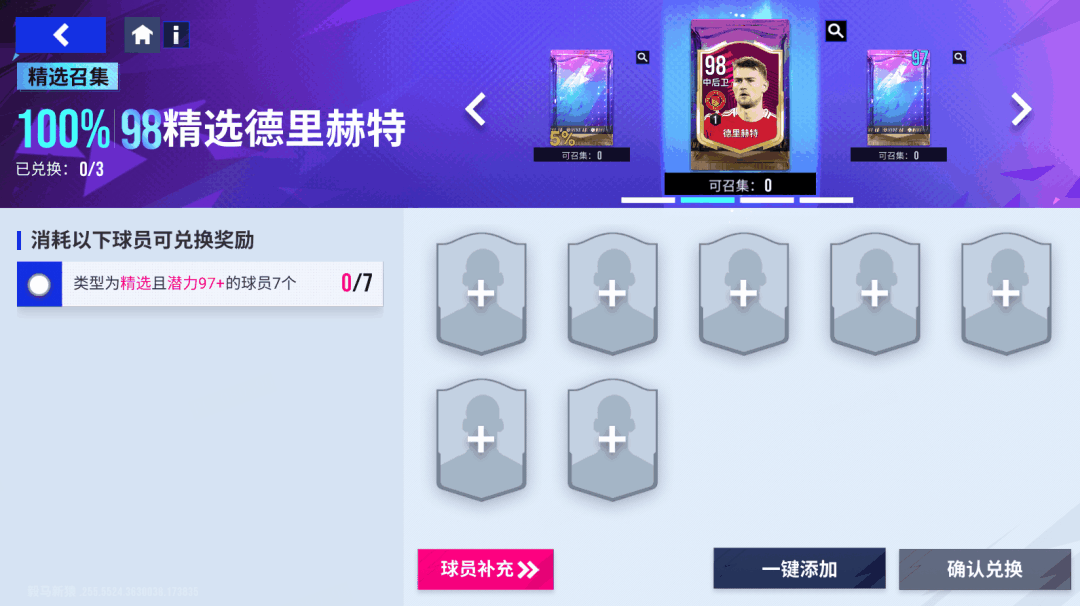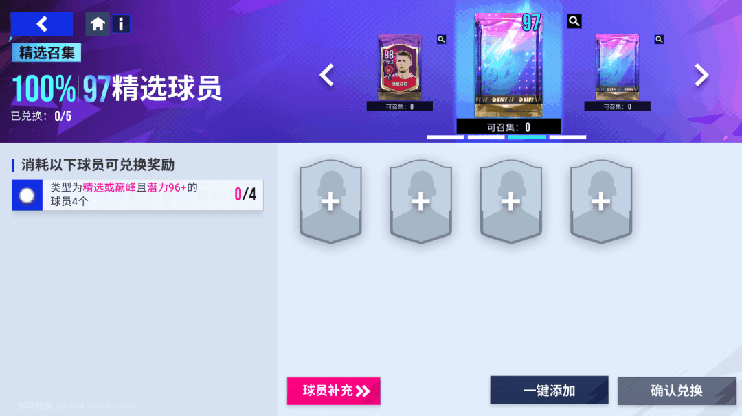 【97精选球员包】阵容召集挑战的兑换条件如下: