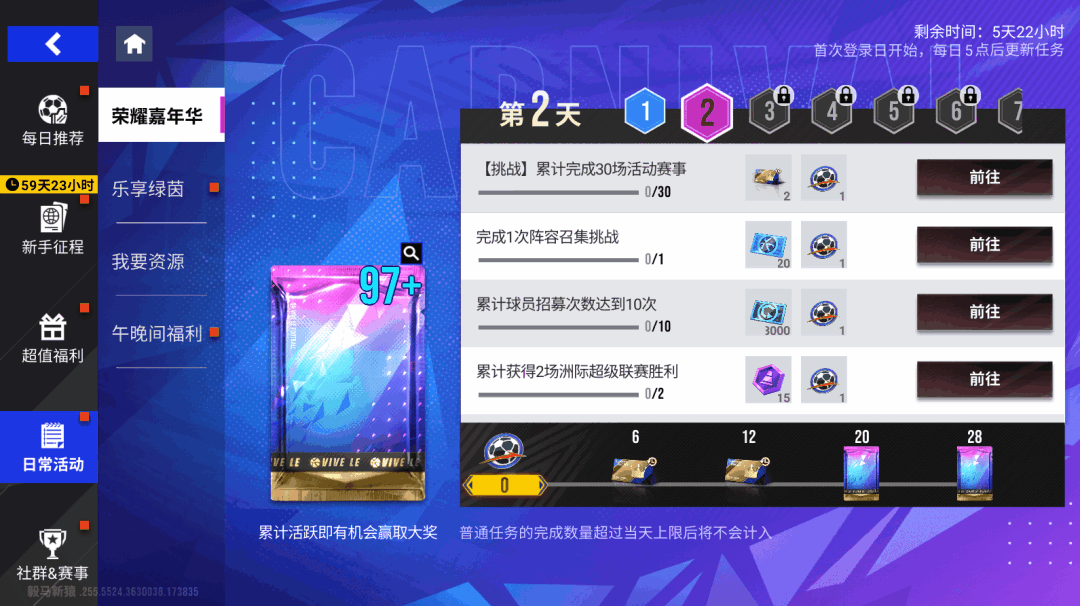 4月18日11时-4月25日11时期间,将开启荣耀嘉年华活动,活动期间每日完成活跃任务即可领取大量道具奖励包括「登场券(限时)」、「动作卡」、「蓝券」、「10%精选球员包」等,更可获得「97+精选球员包」!