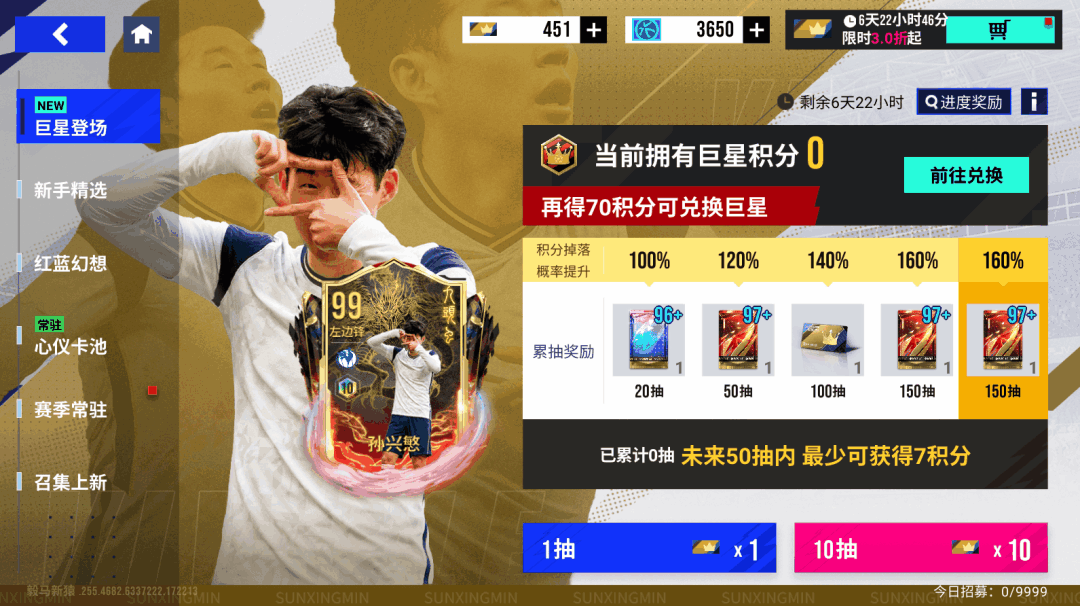 【巨星登场】4月18日11时至4月25日11时期间,将开启巨星登场-99潜力巅峰「西游-九头虫·孙兴慜」,每次开启都有概率获得巨星积分!