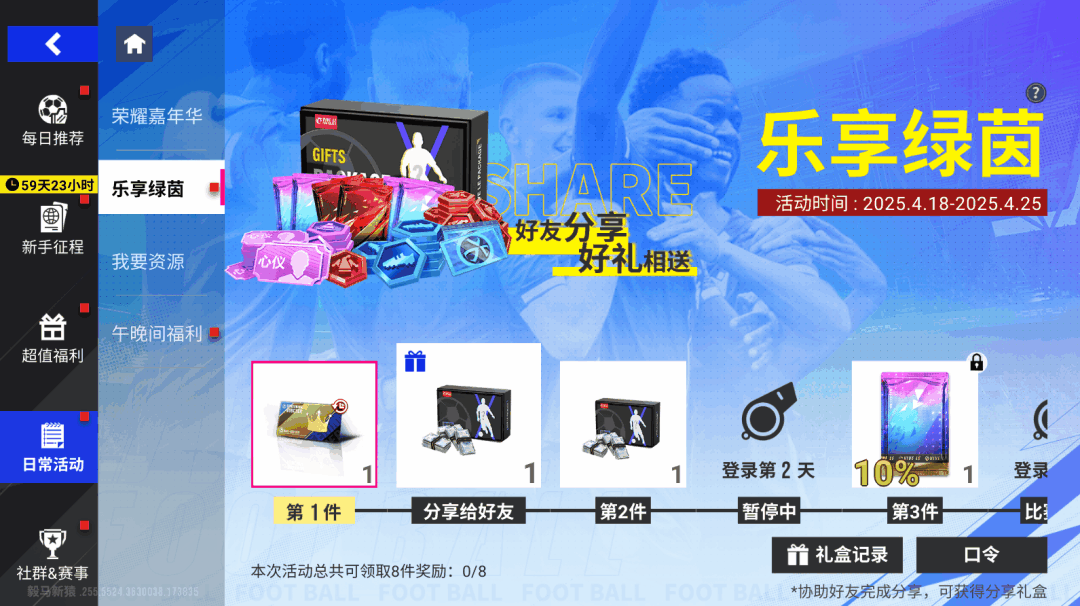 4月18日11时-4月25日11时期间,签到分享领好礼、分享也可获得「分享礼盒」奖励!