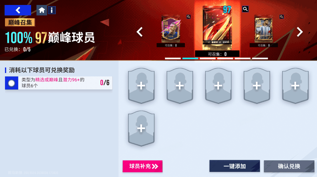 【97巅峰球员包】阵容召集挑战的兑换条件如下: