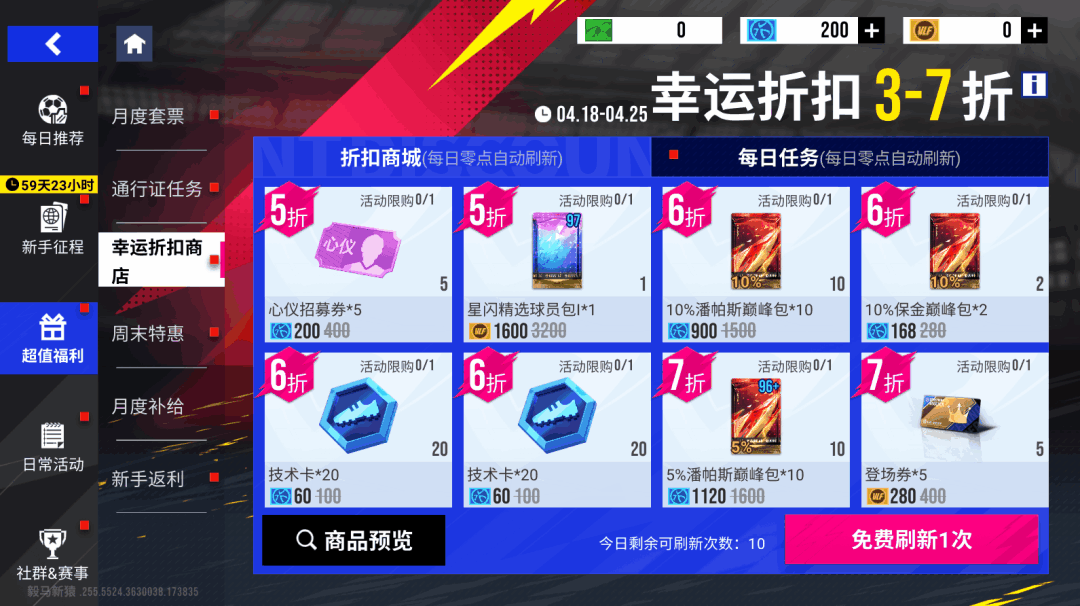 4月18日11时-4月25日11时期间,玩家可以通过完成任务获得「刷新券」,刷新券可以同时刷新商品种类和折扣,最低可至3折,可购买【葡萄牙巅峰球员包】、【20%曼彻斯特红巅峰包】、【10%意大利巅峰包】、【防守悍将球员包】等奖励!