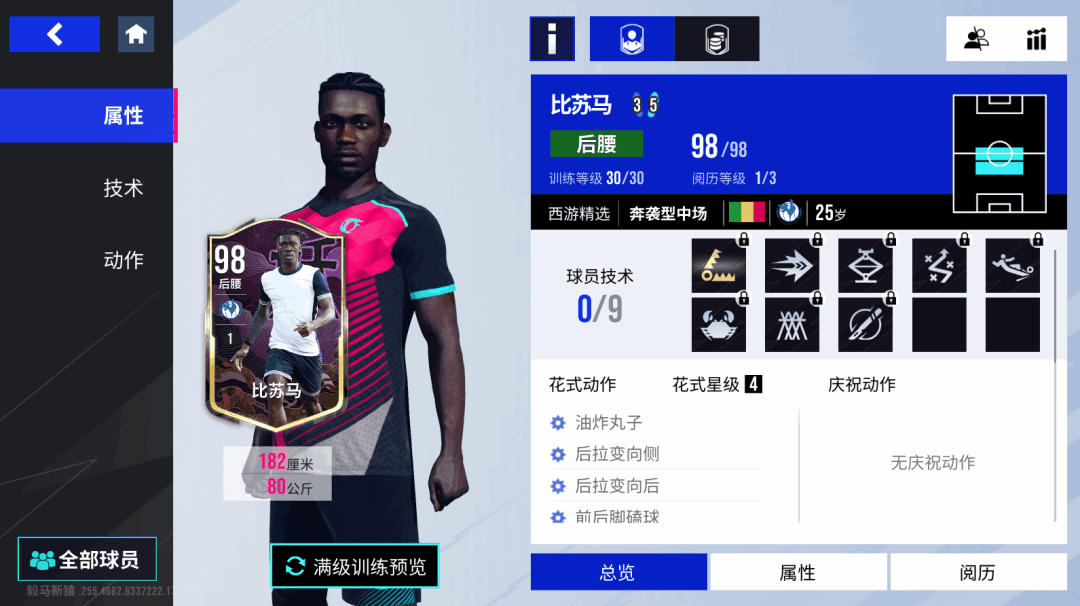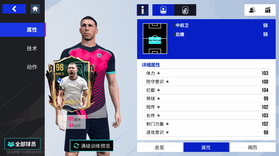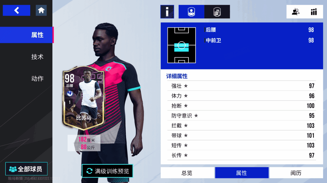本就以拦截见长的比苏马,拥有100的抢断和103的拦截,还自带金色【抢断】技术和【拦截】【滑铲】【跟防】技术,这让他在防守端非常值得信赖,凭借一双大长腿给到对手足够的干扰,而作为一个奔袭型中场,比苏马由守转攻的能力更是一绝,破百的加速,带球和短传能力自不必多说,还拥有【精密带球】【大力传球】和【直塞】技术,能让他在断球后立马带球推进,躲过对手种种逼抢后送出手术刀般的传球,助攻队友摘下胜利果实!