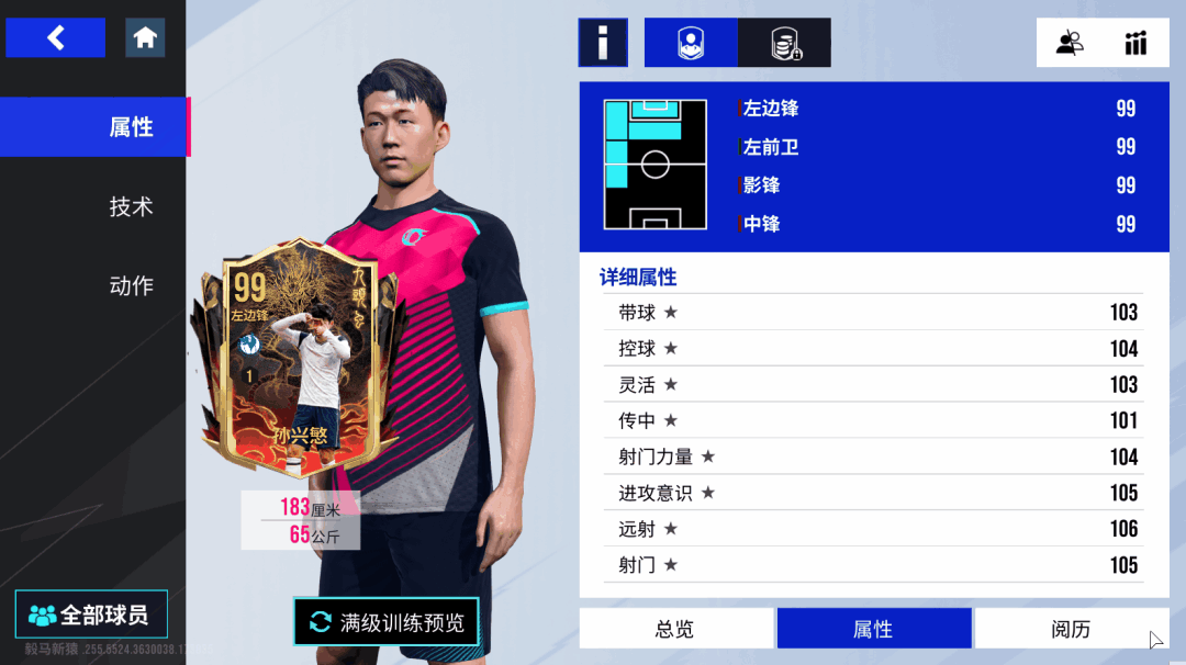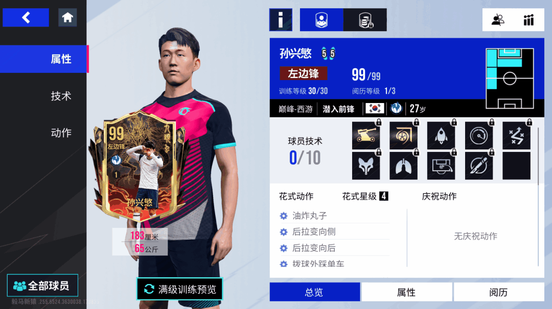 这张99巅峰孙兴慜搭载了西游主题“九头虫”限定卡面!作为一个左右脚能力均衡,技术娴熟的“金靴”级攻击手,孙兴慜在门前的杀伤力不容小觑,金色【搓射】技术和金色【重炮】技术可同时触发,搭配106的远射和105的射门,无论是上演暴力美学的重炮轰门,还是四两拨千斤的远距离搓射,他总有办法将球送入网窝!而当年凭借一条龙破门拿下最佳进球的孙哥,除了拥有105的速度之外,怎会少得了【精密带球】【高速带球】技术?除了极强的突破能力和得分能力外,多次被委以持球核心重任的孙兴慜也练就了不俗的传球脚法,【直塞】【传中】技术可以有效帮助他在完成突破后执行更多的选择。而以体力和勤勉闻名的韩国球员,都拥有着极强的斗志和体力,【孜孜不倦】和【敏锐嗅觉】技术傍身,能让孙兴慜在全场比赛都保持着极强的侵略性,让对手防线时刻神经紧绷,难以招架!
