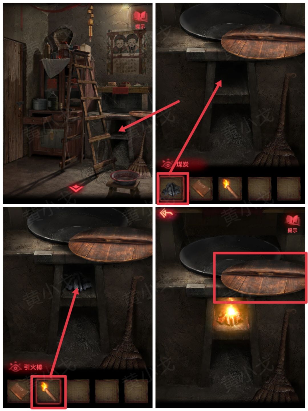 16.点击灶台,把【煤炭】放入灶孔,用【引火棒】点燃,盖上锅盖