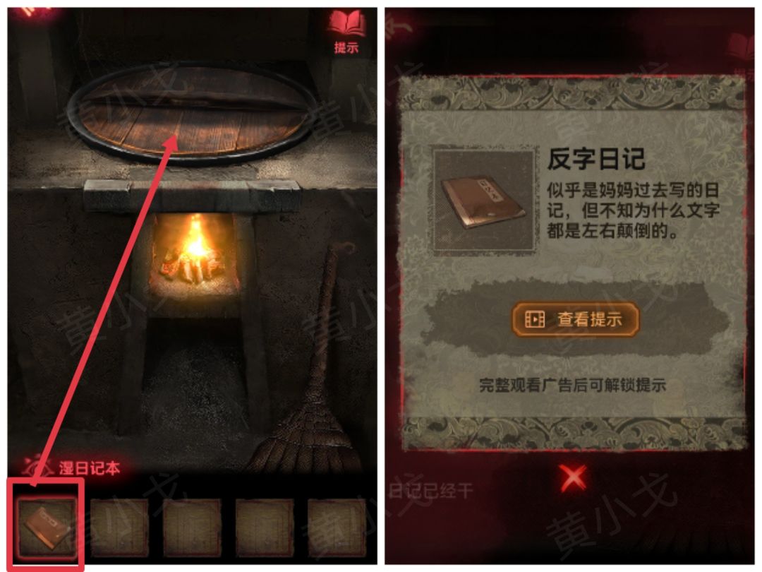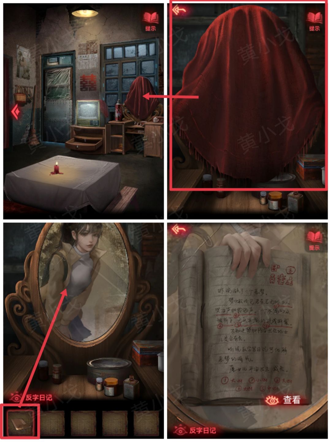 18.点击梳妆台,扯掉红布;拿出【反字日记】,获得线索