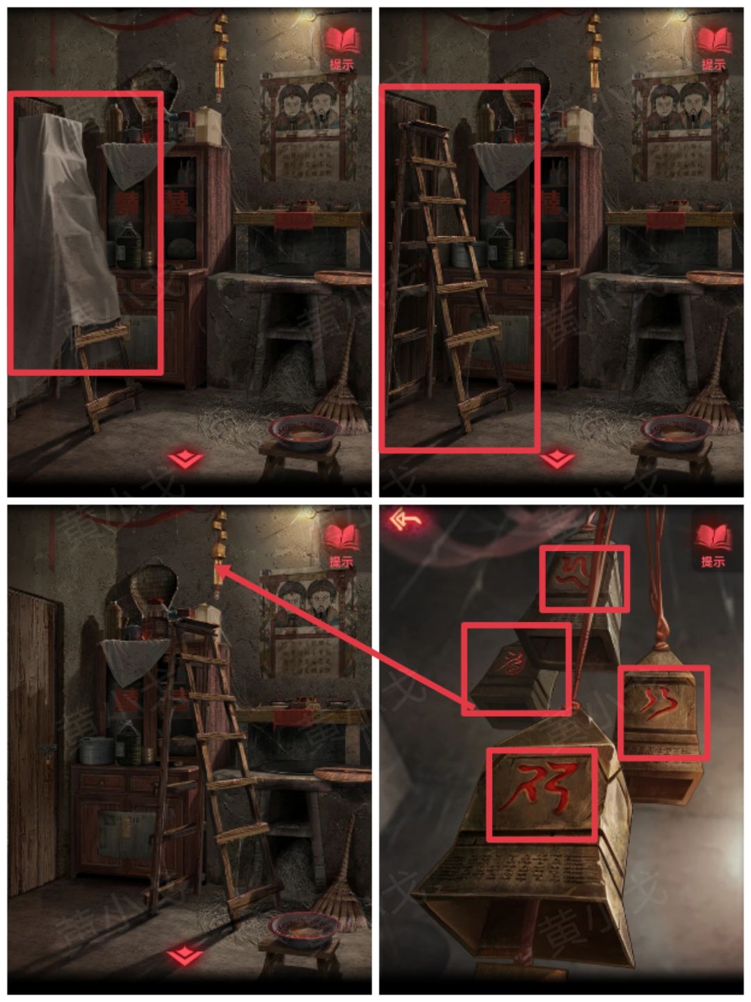 3.拉开木梯上的布,移动梯子;点击查看房梁上的铃铛